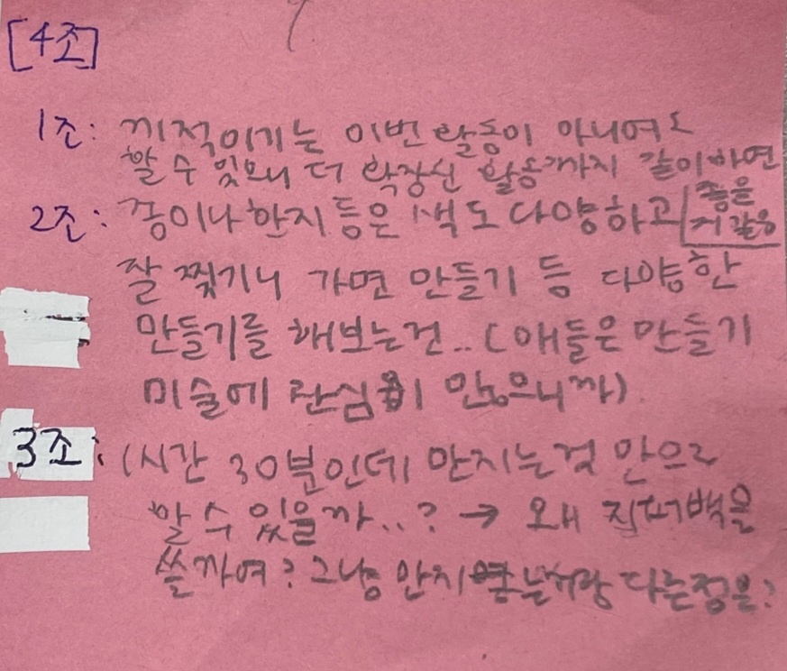 피드백 과정에서 각 모둠은 자신들의 모둠을 제외한 다른 모둠의 활동 계획을 들은 후 떠오르는 피드백 내용을 포스트잇과 메모장에 기록하였고, 이를 단체 대화방에 공유해 각 모둠이 현장 활동 전 준비한 놀이를 보완하는 시간을 가질 수 있도록 안내하며 활동을 마무리하였습니다.