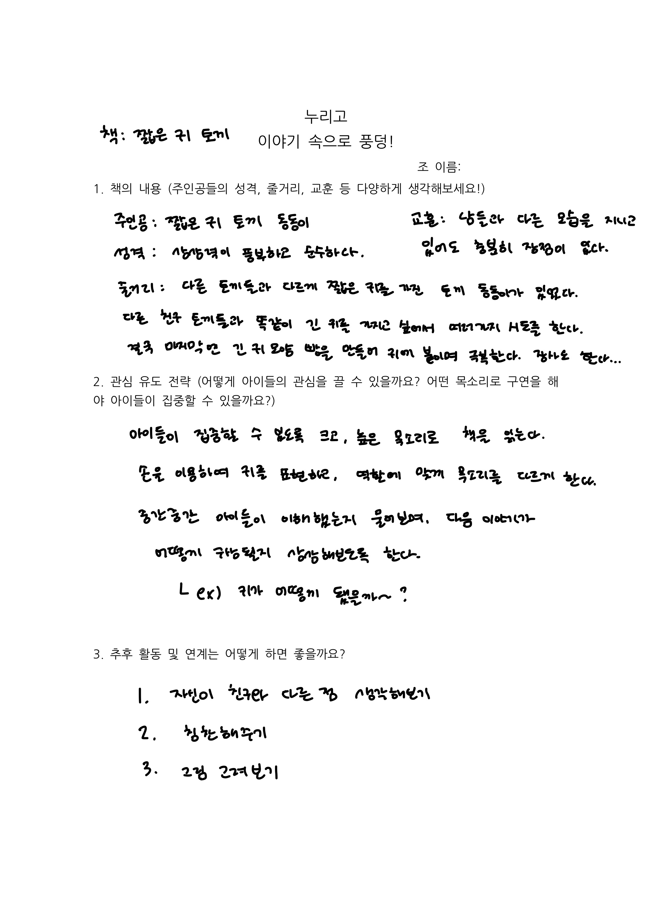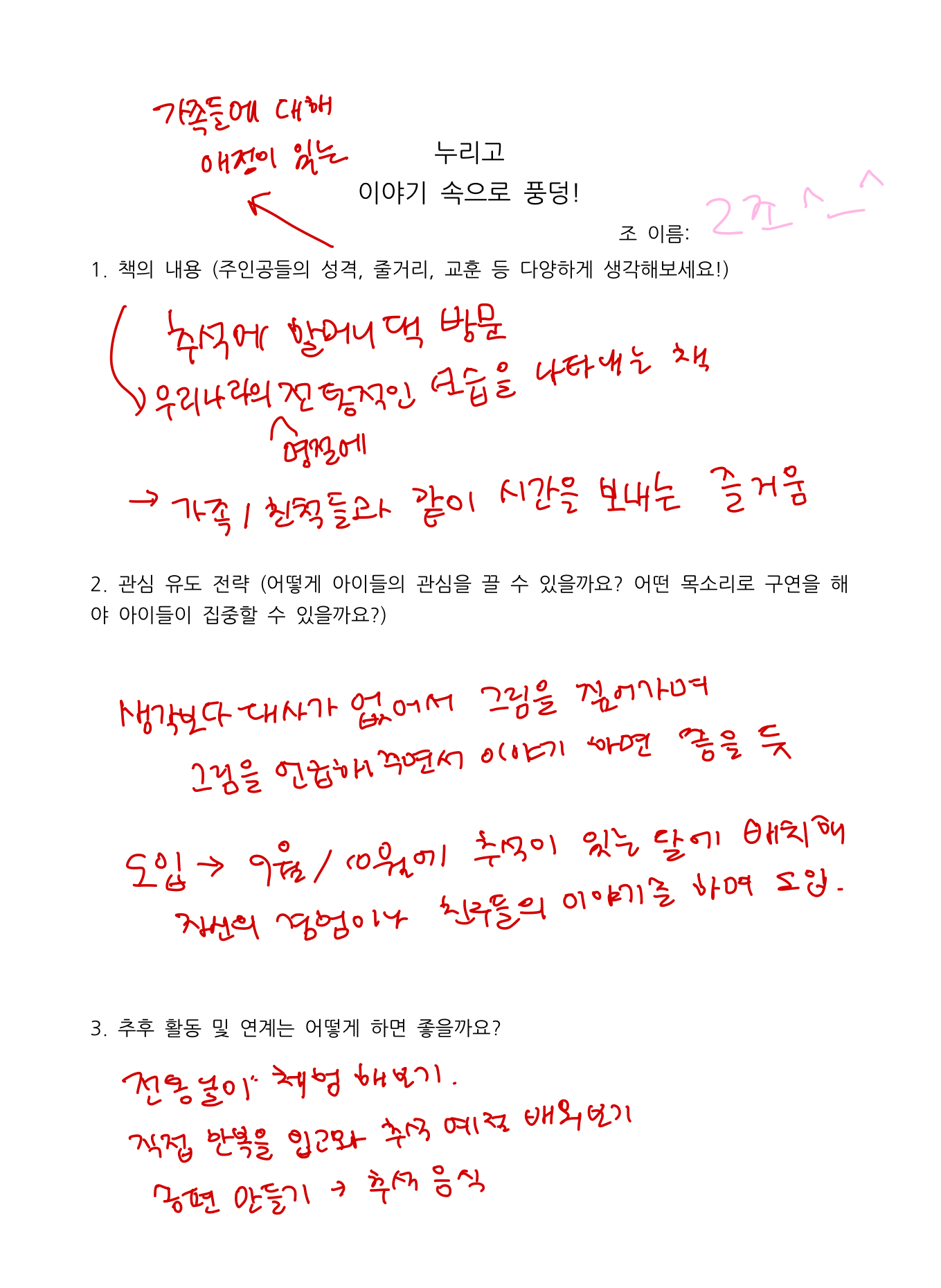 이후 어떤 방식으로 동화의 흥미를 유발할지 전략을 세워보고, 동화와 연계하여 추후에 할 수 있는 활동에 대해 이야기한 후 다른 조 구성원들에게 발표를 해보았습니다.