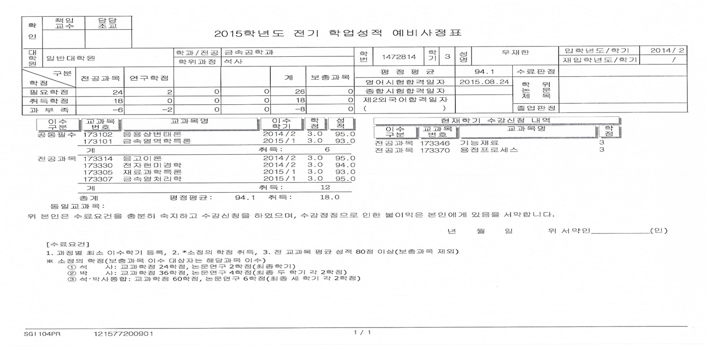 학업성적 예비사정표(2개 학기 이상인 자)